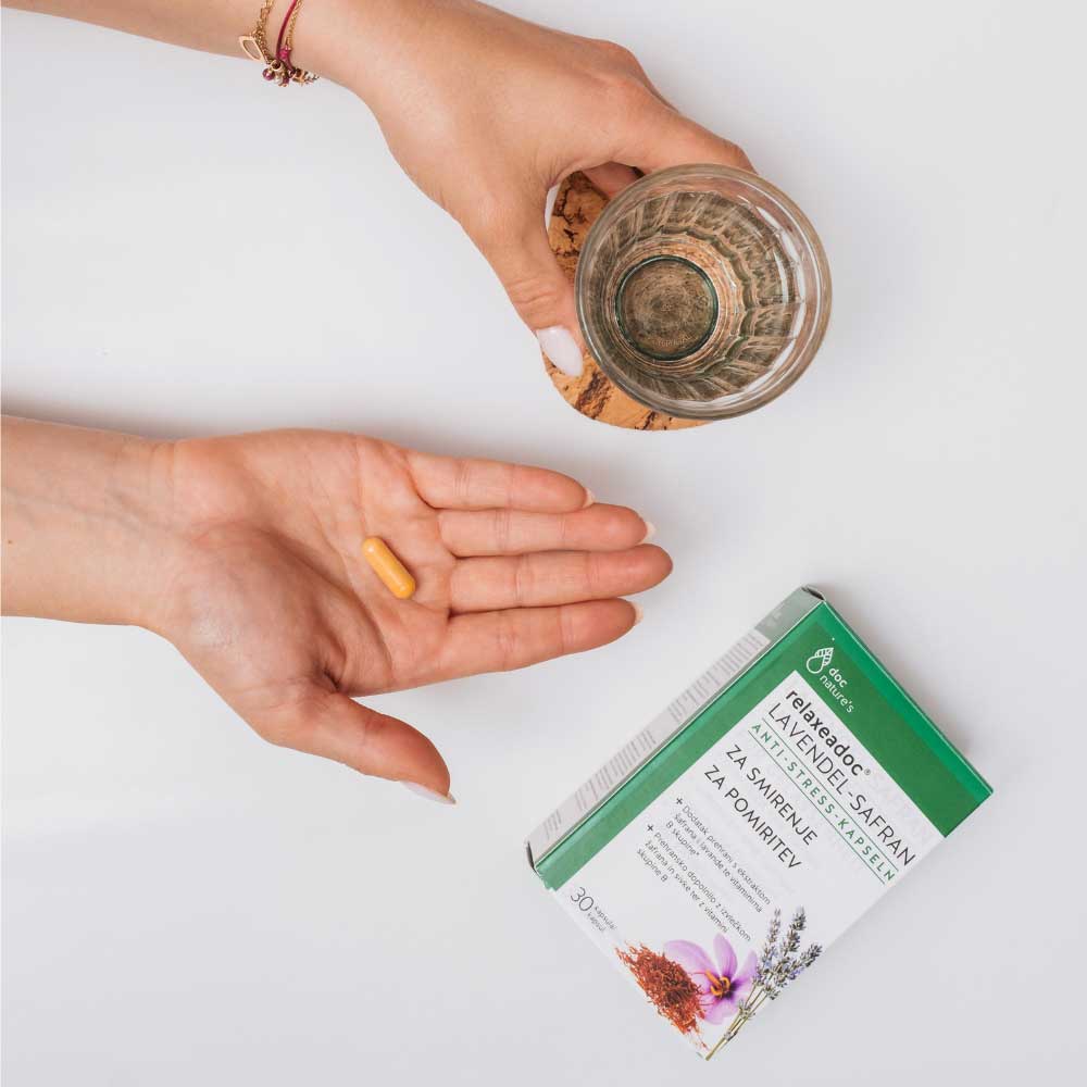 Prehransko dopolnilo z naravnimi sestavinami za čustveno ravnovesje in notranji mir, ki ne povzroča zaspanosti. Edinstvena kombinacija izvlečkov žafrana (30 mg) in sivke (80 mg) ter vitaminov skupine B je zasnovana za podporo psihološkemu zdravju, zmanjšanje utrujenosti in krepitev energije. relaxeadoc je vaša naravna podpora pri vsakdanjih izzivih in za uravnotežen ter aktiven življenjski slog.